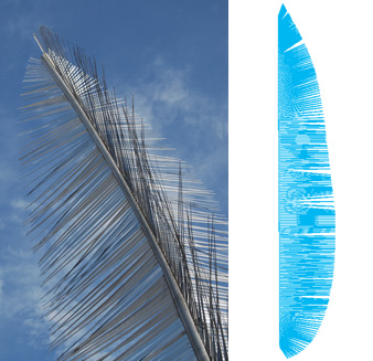 12m high polished steel feather. creates symbolic market cross. draws on forest and industrial heritage.